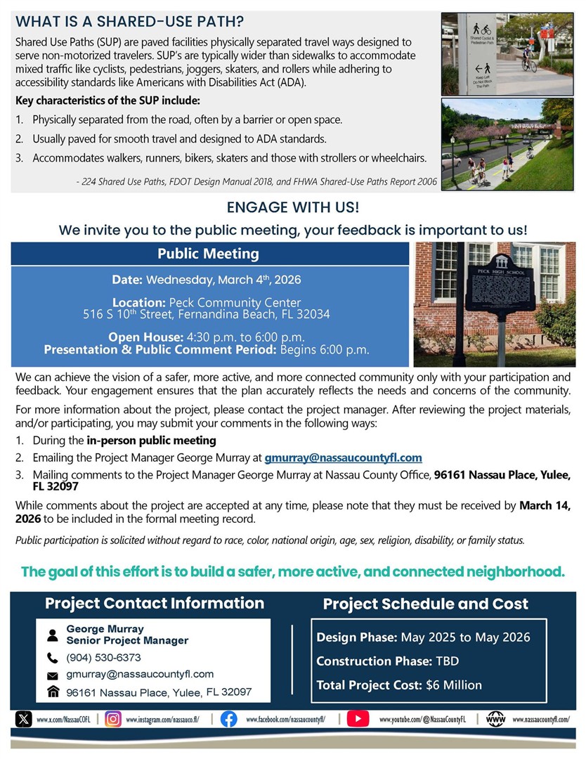 UPDATE ON MAJOR TRAIL PROJECTS IN NASSAU COUNTY - JANUARY 26, 2025 The following is a portion of an email exchange between Mike Pikula, President of Friends of the Amelia Island Trail Inc., and Mr. Robert Companion, Deputy County Manager and Engineer for Nassau County on January 15, 2025. 1. Q. Mr. Companion, can you please provide an update for us on segments 2, 3 and 4 of the Amelia Island Parkway Trail (from Highway A1A/S. Fletcher Av to its intersection with A1A near the Amelia River Bridge) including updated start and finish dates? A. The construction contracts go before the Board (of County Commissioners) for execution for phase 2, 3, & 4 in February (Commission Board meetings on Feb 10th and 24th) (segments 3 and 4 are in one contract, and segment 2 is a separate contract). Each has roughly a ten-month to one-year build duration. Start dates will fall in March 2025 and end dates will be in January to March of 2026. 2. Q. Can you provide an update on the planned roundabout at AI Parkway and Buccaneer Trail? A. The plans are complete. It (the project) will be advertised for construction as soon as the second phase of the Amelia Island Parkway Trail is complete. We will be forced to meet the Federal procurement requirements, wage rates, etc., on the roundabout project if we begin construction within the limits of the federally funded trail project. 3. Q. Can you provide an update on the planned roundabout or traffic light on S.14th St at Simmons Rd? A. At this time it is still a candidate project and remains unfunded. 4. Q. Can you provide an update on the construction plans for the new County roadway and parallel paved path between Minor Rd and US Hwy 17? (This project will serve the two schools in the area and will have a wide sidewalk) A. Construction began on the William Burgess Extension on January 13, 2025. 5. Q. Can you provide an update on the County plan on Amelia Island for a North-to-South, off-road paved path from Sadler Rd to Atlantic Av? A. The RFQ for design was advertised and we received proposals from over ten different firms. I believe we shortlisted 3 firms. The three firms will make presentations to the selection committee in the next week or so. After selecting a firm, negotiations for the design cost will commence. Once the negotiations are complete the contract will go to the Board for execution and the design will begin. I would estimate that the design will begin in April or May of this year. 6. Q. Can you provide an update on the County plan to add bike lanes on Amelia Island alongside SR200/A1A in both directions east of the intracoastal bridge and continuing to the AI Parkway intersection? A. This is still a Mobility project and a candidate project within our Capital Improvement Plan. It is currently not funded. 7. Q. Can you provide an update about when the resurfacing work on SR200/A1A from Old Nassauville Rd east to the intercoastal bridge will be complete; and will marked bike lanes be restored? A. I know the marked bike lanes will be restored. The last schedule I received was (for the) end of February (or) beginning of March. 8. Q. Has there been any further discussion about funding and building a trail alongside N.14th St from Atlantic Av to the North End Boat Ramp? A. We did a study three years ago to determine the feasibility, there are some hurdles to connecting this area environmentally and with(in the) right-of-way. It is not a funded project at this time, although I could see that changing after we complete the Simmons to Hickory trail along Will Hardee, Sadler and 14th. 9. Q. Has there been any specific planning for the new road and trail between Chester Rd and US 17? A. Wildlight is designing and constructing what they refer to as Riverbluff Parkway from Chester Road to US 17, the first phase of which is still under construction. 10. Q. Has there been any further discussion or planning between County and City about the proposed bike path from downtown Fernandina to the beach? A. We haven’t discussed this project specifically; we have mostly conversed about the Schools to Waterfront trail the City has plans for. 11. Q. Are you aware of any info on other new trails or bike paths to be built in Nassau County and/or in Fernandina Beach that you could share with us? A. The Westside Regional Park between Hilliard and Callahan will contain a network of trails through its footprint, but aside from that, I think you are aware of most of the County trail initiatives. For additional information, see future Wildlight developement for proposed parks and trails.