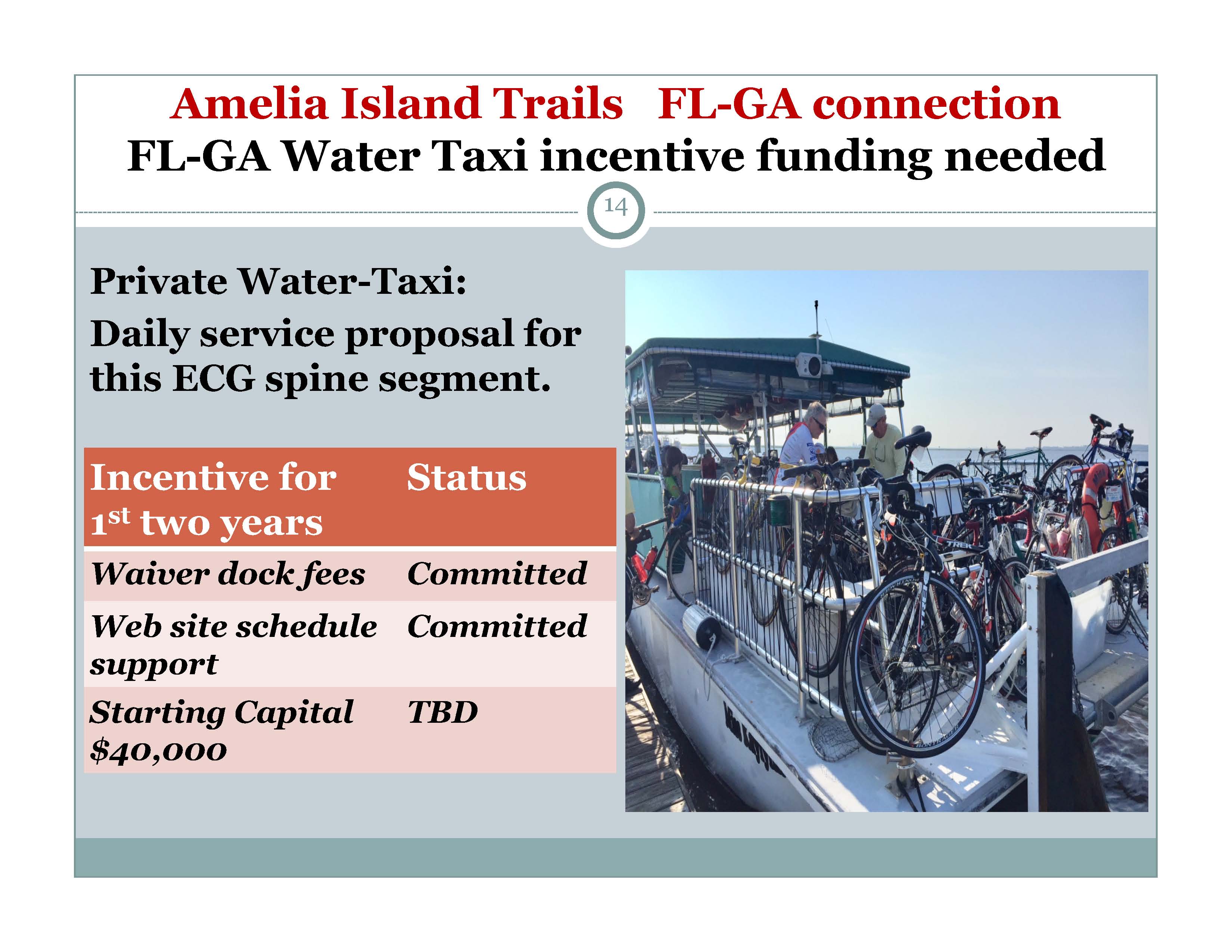 The Friends of the Amelia Island Trails has been working with the city of Fernandina Beach to restablish a water taxi that runs between Fernandina Beach and St Marys, Georgia. On 11/5/19, the city of Fernandina Beach approved Amelia River Excursions to provide the taxi service, with an expected start date of spring 2020 based on restablished fuel service at the marina. Fernandian Beach and St Marys have each approved a $10,000 grant for the service and free dockage for the first two years. The expected start date has been moved back, and now depends on the status the Covid-19 pandemic, Fernandina Beach marina repairs and fuel service, and decisions of the Fernandina Beach and St Marys local governmant. Service may start as early as spring of 2021. Both cities have agreed to carry the funding forward.