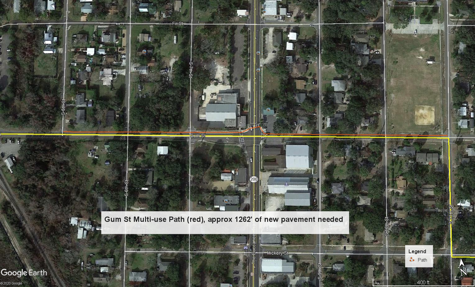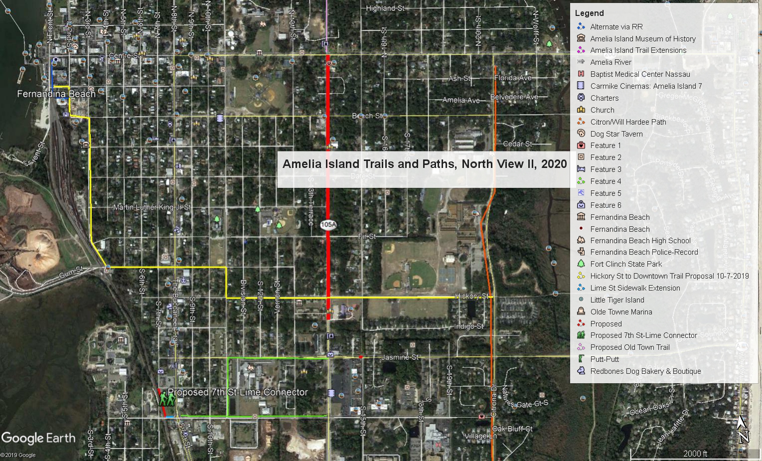 This updated image shows mostly future projects. The yellow line on the map is our major, current project, the Schools to Downtown Waterfront Trail. It would start near FB High School on Citrona Dr. and run westward ending at the City's waterfront. With the anticipated re-start of the Fernandina-St Marys Ferry Service, the SDWT would become a link in the National East Coast Greenway. The light pink line depicts a conceptual Atlantic Av to North End Boat Ramp Trail of 2.3 miles which would basically follow N 14th St. The light green lines depict existing sidewalks around Southside Elementary School which were constructed with funds from a grant from the National Safe Routes to Schools Program. The bold red line depicts the future marking of the existing road shoulder on S 14th St as a bicycle lane; this is expected in the Spring of 2020. The short red line under the walkers silhouette depicts two sidewalk segments proposed as a project for COFB to enhance pedestrian and cyclist safety in this area. The orange line from Atlantic AV southward alongside Citrona Dr. and Will Hardee Rd. to Simmons Rd is a concept to improve sidewalks and/or add a bike trail. Not depicted are the marked bicycle lanes on S Fletcher Av/A1A from Atlantic Av to the south end of Amelia Island which were added several years ago based on FOAIT recommendations and lobbying efforts made to Florida Department of Transportation authorities. By formally requesting addition of bicycle lanes before the resurfacing project was completely planned, this significant 11 mile bicycle lane addition was incorporated into the State's construction contract
