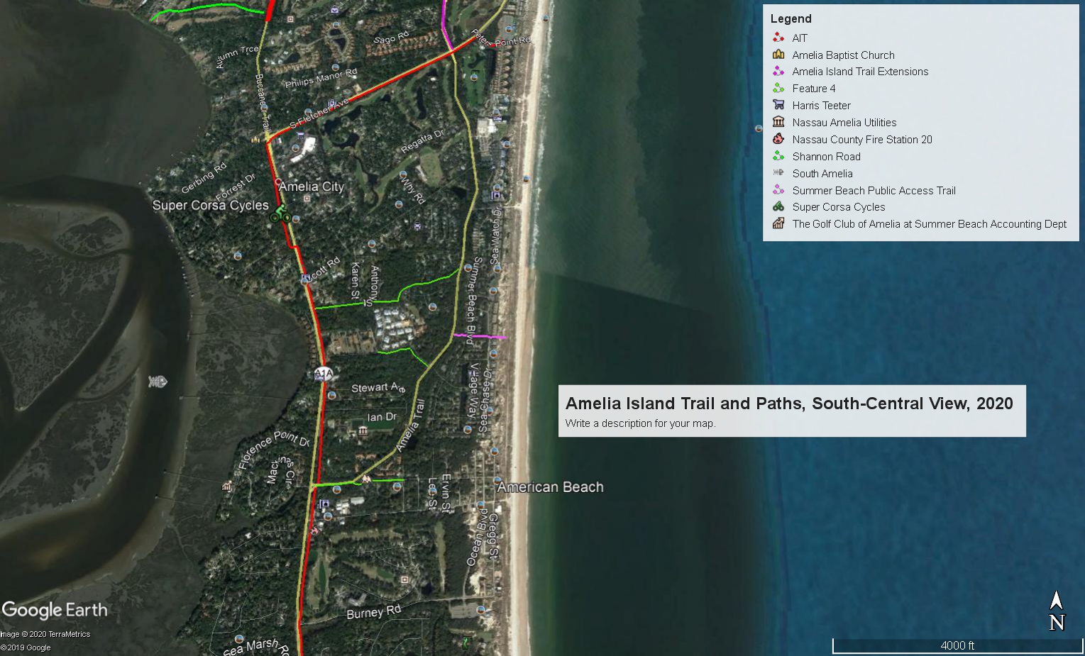 Narrative: This attached map shows the trails and paths in this south-central section of Amelia Island. A. The Amelia Island Trail (in red) begins at its northern trailhead at Peters Point Beachfront Park and initially heads southwest then south alongside S. Fletcher Av/A1A to Burney Road. The AIT trailhead is located within Peters Point Park and has an information kiosk with a map of the entire East Coast Greenway, maps of other local existing and proposed trails, and Nassau County trail rules. After departing the Park, this paved off-road Trail heads southwest, crosses A1A at the S. Fletcher/Buccaneer Trail roundabout, then again crosses A1A just south of Quattlefield Rd. This 6.6 mile trail was funded by a federal grant obtained through the North Florida Transportation Planning Office (NFTPO) and completed in 2013; it is maintained primarily by Nassau County with significant support by the Amelia Island Plantation and trail volunteers. (Description of the southerly portion of the AIT is in the next narrative section.) B. Generally following the Amelia Island Parkway (yellow line) a narrow paved sidewalk winds alongside the road from its intersection with S. Fletcher Av southward for 1.7 miles to its intersection with A1A. This sidewalk, often called the "Summer Beach Trail" serves as a safe "by-path" for local walkers and cyclists. C. Two short trails are depicted in green. The first is a planned trail starting on A1A which will use a recently-closed portion of Orange Av then connect with an existing abandoned roadway to reach Amelia Island Parkway. This project is a collaboration between local community associations and Nassau County. It is not yet named. The second green line nearby on the map depicts a trail which was just paved in October and will soon be open for use. It will provide residents in The Enclave with access to the Amelia Island Parkway. Primary use is expected to be by local residents to walk between their homes/condos and the existing public beach access just to the north along the Parkway. It will be open to the general public (for non motorized use). The purple line marks the Nassau County public beach access trail. D. Starting at the intersection of A1A and Julia St (coincident with AIP) an asphalt sidewalk heads east then branches slightly right to follow Julia St to the American Beach Museum and Community Center. At one time Nassau County planned to continue this trail eastward to Ocean Av then south along Ocean Av then west along Burney Rd back to A1A; however, there has been no follow-up funding identified to complete this concept.