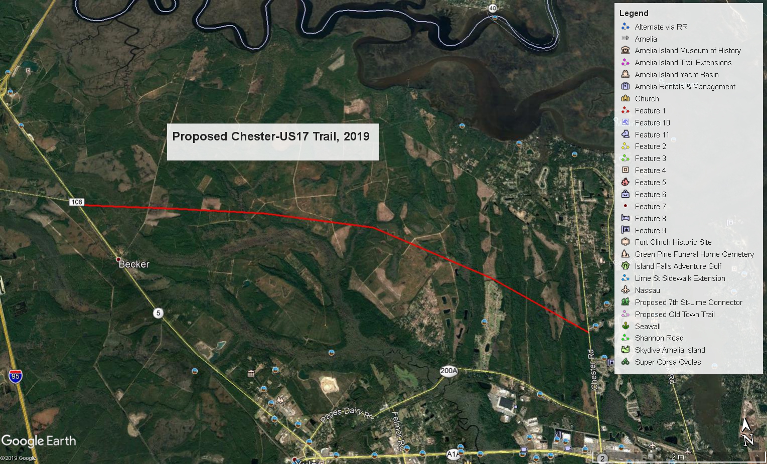 Narrative: This image depicts a notional route for a proposed trail linking Chester Road with US 17. Several years ago, Rayonier, Inc. donated the right-of-way for a new road that would connect Chester Rd with US17. This was done in anticipation of Rayonier building out their residential plan for this area. In discussions with Nassau County in that same time-frame, we proposed that a full-length off-road paved trail also be completed when this new road is constructed. There is no detailed plan, construction start date or promise for this road or the trail, but Friends of the Amelia Island Trail considers this a "place holder" to Nassau County so that when a decision to construct the new road is made, then this proposed parallel 7-mile off-road trail could be seriously considered as a part of that project. Once constructed, this proposed route would likely become a portion of a North-South bicycle corridor (perhaps the East Coast Greenway).