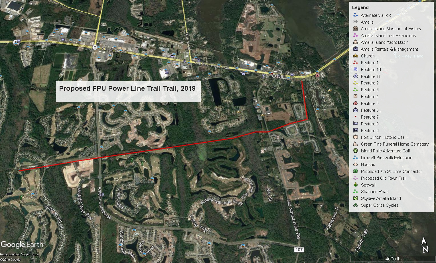 Image 2: (Proposed FPU Power line Trail) Narrative: This image depicts a proposed multi-use trail that would follow the existing FPU power line ROW from A1A near Pine Grove Place (near the sweeping curve of A1A) going south and then westward for approximately 3.5 miles crossing Old Nassauville Rd and Amelia Concourse before terminating at or near Bostick Woods Drive in North Hampton. This trail would serve a large and growing young population moving into this area and would be very deserving of priority support by Nassau County and the FCTPO. It would also serve as an alternative and safer east-west bicycle corridor than A1A, potentially becoming part of the East Coast Greenway. This trail is in the conceptual stage, proposed by the FOAIT to the NC planners.